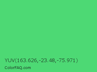 YUV 163.626,-23.48,-75.971 Color is a normal green color and the nearest color is Emerald #50c878. Hex code #4dd974 and RGB value is rgb(77,217,116). In RGB color space, this color is composed of 30% red, 85% green, 45% blue, In CMYK color space, this color is composed of 65% cyan, 0% magenta, 47% yellow , 15% black , In HSL color space, this color has a hue angle of 137° , 65% saturation and 58% lightness.