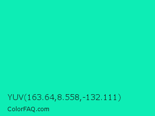 YUV 163.64,8.558,-132.111 Color is a normal cyan color and the nearest color is Medium Spring Green #00fa9a. Hex code #0dedb5 and RGB value is rgb(13,237,181). In RGB color space, this color is composed of 5% red, 93% green, 71% blue, In CMYK color space, this color is composed of 95% cyan, 0% magenta, 24% yellow , 7% black , In HSL color space, this color has a hue angle of 165° , 90% saturation and 49% lightness.