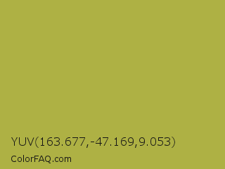 YUV 163.677,-47.169,9.053 Color is a normal yellow color and the nearest color is Brass #b5a642. Hex code #aeb144 and RGB value is rgb(174,177,68). In RGB color space, this color is composed of 68% red, 69% green, 27% blue, In CMYK color space, this color is composed of 2% cyan, 0% magenta, 62% yellow , 31% black , In HSL color space, this color has a hue angle of 62° , 44% saturation and 48% lightness.