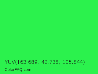 YUV 163.689,-42.738,-105.844 Color is a normal green color and the nearest color is Malachite #0bda51. Hex code #2bf24d and RGB value is rgb(43,242,77). In RGB color space, this color is composed of 17% red, 95% green, 30% blue, In CMYK color space, this color is composed of 82% cyan, 0% magenta, 68% yellow , 5% black , In HSL color space, this color has a hue angle of 130° , 88% saturation and 56% lightness.