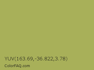 YUV 163.69,-36.822,3.78 Color is a normal yellow color and the nearest color is Olive Green #b5b35c. Hex code #a8b059 and RGB value is rgb(168,176,89). In RGB color space, this color is composed of 66% red, 69% green, 35% blue, In CMYK color space, this color is composed of 5% cyan, 0% magenta, 49% yellow , 31% black , In HSL color space, this color has a hue angle of 66° , 36% saturation and 52% lightness.