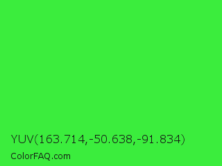 YUV 163.714,-50.638,-91.834 Color is a normal green color and the nearest color is Lime Green #32cd32. Hex code #3bed3d and RGB value is rgb(59,237,61). In RGB color space, this color is composed of 23% red, 93% green, 24% blue, In CMYK color space, this color is composed of 75% cyan, 0% magenta, 74% yellow , 7% black , In HSL color space, this color has a hue angle of 121° , 83% saturation and 58% lightness.
