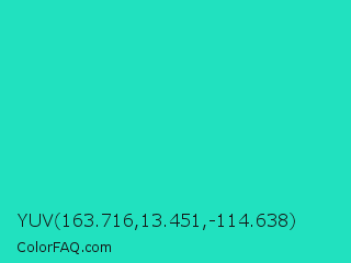 YUV 163.716,13.451,-114.638 Color is a normal cyan color and the nearest color is Turquoise PWG #30d5c8. Hex code #21e1bf and RGB value is rgb(33,225,191). In RGB color space, this color is composed of 13% red, 88% green, 75% blue, In CMYK color space, this color is composed of 85% cyan, 0% magenta, 15% yellow , 12% black , In HSL color space, this color has a hue angle of 169° , 76% saturation and 51% lightness.