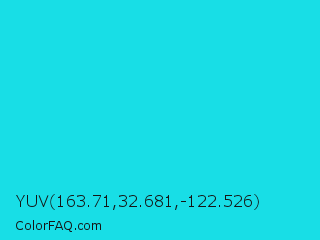 YUV 163.71,32.681,-122.526 Color is a normal cyan color and the nearest color is Bright Turquoise #08e8de. Hex code #18dee6 and RGB value is rgb(24,222,230). In RGB color space, this color is composed of 9% red, 87% green, 90% blue, In CMYK color space, this color is composed of 90% cyan, 3% magenta, 0% yellow , 10% black , In HSL color space, this color has a hue angle of 182° , 81% saturation and 50% lightness.