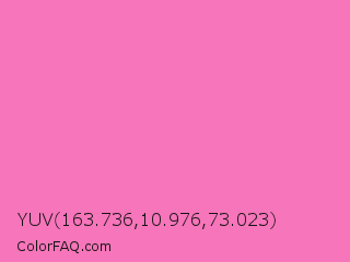 YUV 163.736,10.976,73.023 Color is a light rose color and the nearest color is Persian Pink #f77fbe. Hex code #f775ba and RGB value is rgb(247,117,186). In RGB color space, this color is composed of 97% red, 46% green, 73% blue, In CMYK color space, this color is composed of 0% cyan, 53% magenta, 25% yellow , 3% black , In HSL color space, this color has a hue angle of 328° , 89% saturation and 71% lightness.