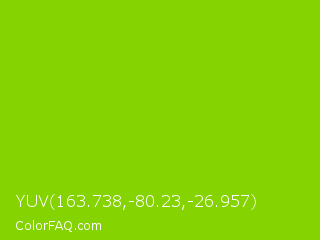 YUV 163.738,-80.23,-26.957 Color is a normal green color and the nearest color is Sheen Green #8fd400. Hex code #85d301 and RGB value is rgb(133,211,1). In RGB color space, this color is composed of 52% red, 83% green, 0% blue, In CMYK color space, this color is composed of 37% cyan, 0% magenta, 100% yellow , 17% black , In HSL color space, this color has a hue angle of 82° , 99% saturation and 42% lightness.