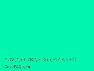 YUV 163.782,3.065,-143.637 Color is a normal green color and the nearest color is Medium Spring Green #00fa9a. Hex code #00f6aa and RGB value is rgb(0,246,170). In RGB color space, this color is composed of 0% red, 96% green, 67% blue, In CMYK color space, this color is composed of 100% cyan, 0% magenta, 31% yellow , 4% black , In HSL color space, this color has a hue angle of 161° , 100% saturation and 48% lightness.