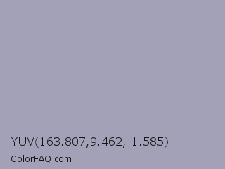 YUV 163.807,9.462,-1.585 Color is a light indigo color and the nearest color is Santas Gray #9fa0b1. Hex code #a2a1b7 and RGB value is rgb(162,161,183). In RGB color space, this color is composed of 64% red, 63% green, 72% blue, In CMYK color space, this color is composed of 11% cyan, 12% magenta, 0% yellow , 28% black , In HSL color space, this color has a hue angle of 243° , 13% saturation and 67% lightness.