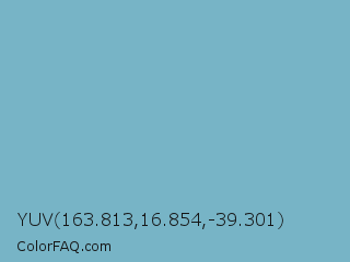 YUV 163.813,16.854,-39.301 Color is a light blue color and the nearest color is Glacier #80b3c4. Hex code #77b4c6 and RGB value is rgb(119,180,198). In RGB color space, this color is composed of 47% red, 71% green, 78% blue, In CMYK color space, this color is composed of 40% cyan, 9% magenta, 0% yellow , 22% black , In HSL color space, this color has a hue angle of 194° , 41% saturation and 62% lightness.