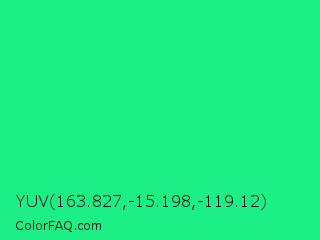 YUV 163.827,-15.198,-119.12 Color is a normal green color and the nearest color is Spring Green #00ff7f. Hex code #1cef85 and RGB value is rgb(28,239,133). In RGB color space, this color is composed of 11% red, 94% green, 52% blue, In CMYK color space, this color is composed of 88% cyan, 0% magenta, 44% yellow , 6% black , In HSL color space, this color has a hue angle of 150° , 87% saturation and 52% lightness.