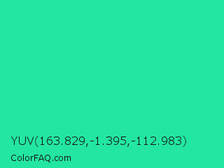 YUV 163.829,-1.395,-112.983 Color is a normal green color and the nearest color is Shamrock #33cc99. Hex code #23e6a1 and RGB value is rgb(35,230,161). In RGB color space, this color is composed of 14% red, 90% green, 63% blue, In CMYK color space, this color is composed of 85% cyan, 0% magenta, 30% yellow , 10% black , In HSL color space, this color has a hue angle of 159° , 80% saturation and 52% lightness.