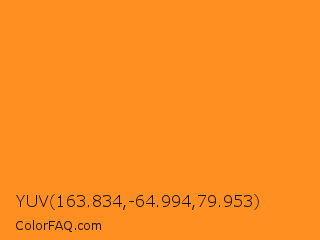 YUV 163.834,-64.994,79.953 Color is a normal orange color and the nearest color is Tree Poppy #fc9c1d. Hex code #ff8f20 and RGB value is rgb(255,143,32). In RGB color space, this color is composed of 100% red, 56% green, 13% blue, In CMYK color space, this color is composed of 0% cyan, 44% magenta, 87% yellow , 0% black , In HSL color space, this color has a hue angle of 30° , 100% saturation and 56% lightness.