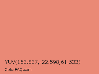 YUV 163.837,-22.598,61.533 Color is a light red color and the nearest color is Middle Red #e58e73. Hex code #ea8976 and RGB value is rgb(234,137,118). In RGB color space, this color is composed of 92% red, 54% green, 46% blue, In CMYK color space, this color is composed of 0% cyan, 41% magenta, 50% yellow , 8% black , In HSL color space, this color has a hue angle of 10° , 73% saturation and 69% lightness.