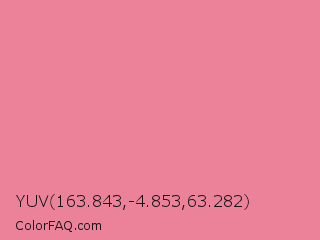 YUV 163.843,-4.853,63.282 Color is a light red color and the nearest color is Bright Blush #e47698. Hex code #ec819a and RGB value is rgb(236,129,154). In RGB color space, this color is composed of 93% red, 51% green, 60% blue, In CMYK color space, this color is composed of 0% cyan, 45% magenta, 35% yellow , 7% black , In HSL color space, this color has a hue angle of 346° , 74% saturation and 72% lightness.