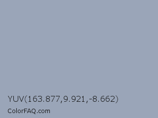 YUV 163.877,9.921,-8.662 Color is a light blue color and the nearest color is Gull Gray #9dacb7. Hex code #9aa5b8 and RGB value is rgb(154,165,184). In RGB color space, this color is composed of 60% red, 65% green, 72% blue, In CMYK color space, this color is composed of 16% cyan, 10% magenta, 0% yellow , 28% black , In HSL color space, this color has a hue angle of 218° , 17% saturation and 66% lightness.