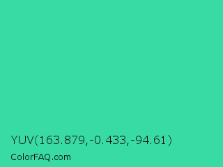 YUV 163.879,-0.433,-94.61 Color is a normal green color and the nearest color is Eucalyptus #44d7a8. Hex code #38dba3 and RGB value is rgb(56,219,163). In RGB color space, this color is composed of 22% red, 86% green, 64% blue, In CMYK color space, this color is composed of 74% cyan, 0% magenta, 26% yellow , 14% black , In HSL color space, this color has a hue angle of 159° , 69% saturation and 54% lightness.