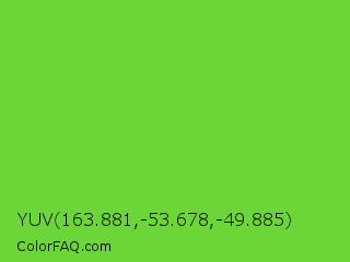 YUV 163.881,-53.678,-49.885 Color is a normal green color and the nearest color is Green RYB #66b032. Hex code #6bd637 and RGB value is rgb(107,214,55). In RGB color space, this color is composed of 42% red, 84% green, 22% blue, In CMYK color space, this color is composed of 50% cyan, 0% magenta, 74% yellow , 16% black , In HSL color space, this color has a hue angle of 100° , 66% saturation and 53% lightness.