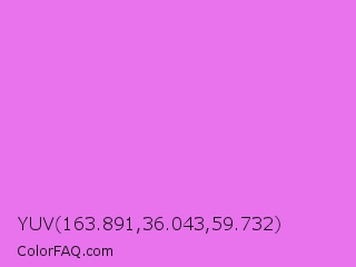 YUV 163.891,36.043,59.732 Color is a light magenta color and the nearest color is Lavender Magenta #ee82ee. Hex code #e873ed and RGB value is rgb(232,115,237). In RGB color space, this color is composed of 91% red, 45% green, 93% blue, In CMYK color space, this color is composed of 2% cyan, 51% magenta, 0% yellow , 7% black , In HSL color space, this color has a hue angle of 298° , 77% saturation and 69% lightness.
