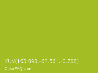 YUV 163.898,-62.561,-0.788 Color is a normal yellow color and the nearest color is Acid Green #b0bf1a. Hex code #a3bd25 and RGB value is rgb(163,189,37). In RGB color space, this color is composed of 64% red, 74% green, 15% blue, In CMYK color space, this color is composed of 14% cyan, 0% magenta, 80% yellow , 26% black , In HSL color space, this color has a hue angle of 70° , 67% saturation and 44% lightness.