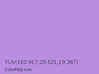 YUV 163.917,29.621,19.367 Color is a light purple color and the nearest color is Bright Lavender #bf94e4. Hex code #ba8de0 and RGB value is rgb(186,141,224). In RGB color space, this color is composed of 73% red, 55% green, 88% blue, In CMYK color space, this color is composed of 17% cyan, 37% magenta, 0% yellow , 12% black , In HSL color space, this color has a hue angle of 273° , 57% saturation and 72% lightness.
