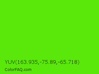 YUV 163.935,-75.89,-65.718 Color is a normal green color and the nearest color is Bright Green #66ff00. Hex code #59e80a and RGB value is rgb(89,232,10). In RGB color space, this color is composed of 35% red, 91% green, 4% blue, In CMYK color space, this color is composed of 62% cyan, 0% magenta, 96% yellow , 9% black , In HSL color space, this color has a hue angle of 99° , 92% saturation and 47% lightness.