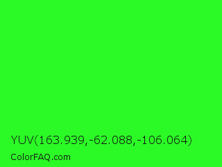 YUV 163.939,-62.088,-106.064 Color is a normal green color and the nearest color is Neon Green #39ff14. Hex code #2bfa26 and RGB value is rgb(43,250,38). In RGB color space, this color is composed of 17% red, 98% green, 15% blue, In CMYK color space, this color is composed of 83% cyan, 0% magenta, 85% yellow , 2% black , In HSL color space, this color has a hue angle of 119° , 95% saturation and 56% lightness.