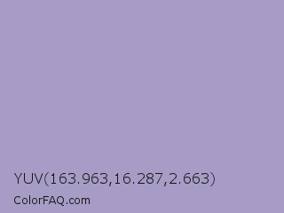 YUV 163.963,16.287,2.663 Color is a light indigo color and the nearest color is Blue Bell #a2a2d0. Hex code #a79cc5 and RGB value is rgb(167,156,197). In RGB color space, this color is composed of 65% red, 61% green, 77% blue, In CMYK color space, this color is composed of 15% cyan, 21% magenta, 0% yellow , 23% black , In HSL color space, this color has a hue angle of 256° , 26% saturation and 69% lightness.