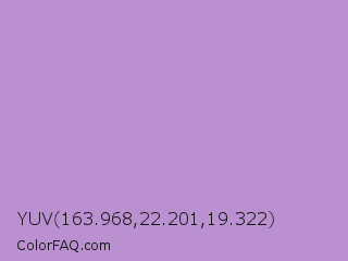 YUV 163.968,22.201,19.322 Color is a light purple color and the nearest color is East Side #ac91ce. Hex code #ba90d1 and RGB value is rgb(186,144,209). In RGB color space, this color is composed of 73% red, 56% green, 82% blue, In CMYK color space, this color is composed of 11% cyan, 31% magenta, 0% yellow , 18% black , In HSL color space, this color has a hue angle of 279° , 41% saturation and 69% lightness.