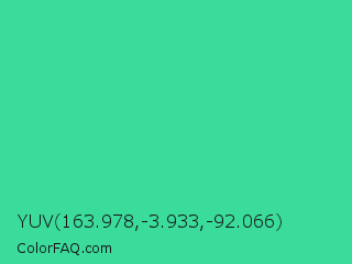 YUV 163.978,-3.933,-92.066 Color is a normal green color and the nearest color is Eucalyptus #44d7a8. Hex code #3bdb9c and RGB value is rgb(59,219,156). In RGB color space, this color is composed of 23% red, 86% green, 61% blue, In CMYK color space, this color is composed of 73% cyan, 0% magenta, 29% yellow , 14% black , In HSL color space, this color has a hue angle of 156° , 69% saturation and 55% lightness.