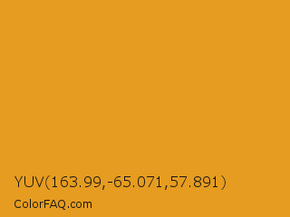YUV 163.99,-65.071,57.891 Color is a normal orange color and the nearest color is Marigold #eaa221. Hex code #e69c20 and RGB value is rgb(230,156,32). In RGB color space, this color is composed of 90% red, 61% green, 13% blue, In CMYK color space, this color is composed of 0% cyan, 32% magenta, 86% yellow , 10% black , In HSL color space, this color has a hue angle of 38° , 80% saturation and 51% lightness.