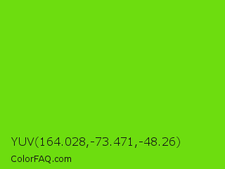 YUV 164.028,-73.471,-48.26 Color is a normal green color and the nearest color is Alien Armpit #84de02. Hex code #6ddd0f and RGB value is rgb(109,221,15). In RGB color space, this color is composed of 43% red, 87% green, 6% blue, In CMYK color space, this color is composed of 51% cyan, 0% magenta, 93% yellow , 13% black , In HSL color space, this color has a hue angle of 93° , 87% saturation and 46% lightness.