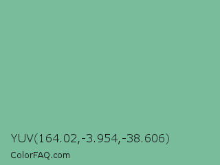 YUV 164.02,-3.954,-38.606 Color is a normal green color and the nearest color is Acapulco #7cb0a1. Hex code #78bc9c and RGB value is rgb(120,188,156). In RGB color space, this color is composed of 47% red, 74% green, 61% blue, In CMYK color space, this color is composed of 36% cyan, 0% magenta, 17% yellow , 26% black , In HSL color space, this color has a hue angle of 152° , 34% saturation and 60% lightness.