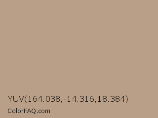 YUV 164.038,-14.316,18.384 Color is a light orange color and the nearest color is Mongoose #b5a27f. Hex code #b99f87 and RGB value is rgb(185,159,135). In RGB color space, this color is composed of 73% red, 62% green, 53% blue, In CMYK color space, this color is composed of 0% cyan, 14% magenta, 27% yellow , 27% black , In HSL color space, this color has a hue angle of 29° , 26% saturation and 63% lightness.