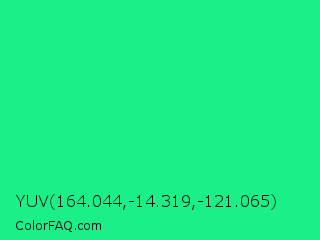YUV 164.044,-14.319,-121.065 Color is a normal green color and the nearest color is Spring Green #00ff7f. Hex code #1af087 and RGB value is rgb(26,240,135). In RGB color space, this color is composed of 10% red, 94% green, 53% blue, In CMYK color space, this color is composed of 89% cyan, 0% magenta, 44% yellow , 6% black , In HSL color space, this color has a hue angle of 151° , 88% saturation and 52% lightness.
