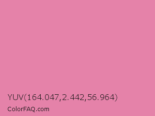 YUV 164.047,2.442,56.964 Color is a light rose color and the nearest color is Carissma #ea88a8. Hex code #e582a9 and RGB value is rgb(229,130,169). In RGB color space, this color is composed of 90% red, 51% green, 66% blue, In CMYK color space, this color is composed of 0% cyan, 43% magenta, 26% yellow , 10% black , In HSL color space, this color has a hue angle of 336° , 66% saturation and 70% lightness.