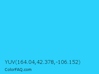YUV 164.04,42.378,-106.152 Color is a normal cyan color and the nearest color is Spiro Disco Ball #0fc0fc. Hex code #2bd1fa and RGB value is rgb(43,209,250). In RGB color space, this color is composed of 17% red, 82% green, 98% blue, In CMYK color space, this color is composed of 83% cyan, 16% magenta, 0% yellow , 2% black , In HSL color space, this color has a hue angle of 192° , 95% saturation and 57% lightness.