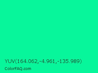 YUV 164.062,-4.961,-135.989 Color is a normal green color and the nearest color is Medium Spring Green #00fa9a. Hex code #09f59a and RGB value is rgb(9,245,154). In RGB color space, this color is composed of 4% red, 96% green, 60% blue, In CMYK color space, this color is composed of 96% cyan, 0% magenta, 37% yellow , 4% black , In HSL color space, this color has a hue angle of 157° , 93% saturation and 50% lightness.