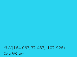 YUV 164.063,37.437,-107.926 Color is a normal cyan color and the nearest color is Spiro Disco Ball #0fc0fc. Hex code #29d4f0 and RGB value is rgb(41,212,240). In RGB color space, this color is composed of 16% red, 83% green, 94% blue, In CMYK color space, this color is composed of 83% cyan, 12% magenta, 0% yellow , 6% black , In HSL color space, this color has a hue angle of 188° , 87% saturation and 55% lightness.