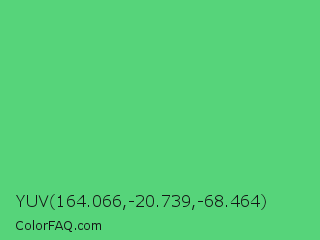 YUV 164.066,-20.739,-68.464 Color is a normal green color and the nearest color is Emerald #50c878. Hex code #56d47a and RGB value is rgb(86,212,122). In RGB color space, this color is composed of 34% red, 83% green, 48% blue, In CMYK color space, this color is composed of 59% cyan, 0% magenta, 42% yellow , 17% black , In HSL color space, this color has a hue angle of 137° , 59% saturation and 58% lightness.
