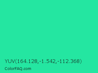 YUV 164.128,-1.542,-112.368 Color is a normal green color and the nearest color is Shamrock #33cc99. Hex code #24e6a1 and RGB value is rgb(36,230,161). In RGB color space, this color is composed of 14% red, 90% green, 63% blue, In CMYK color space, this color is composed of 84% cyan, 0% magenta, 30% yellow , 10% black , In HSL color space, this color has a hue angle of 159° , 80% saturation and 52% lightness.