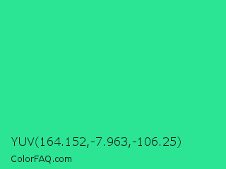YUV 164.152,-7.963,-106.25 Color is a normal green color and the nearest color is Shamrock #33cc99. Hex code #2be594 and RGB value is rgb(43,229,148). In RGB color space, this color is composed of 17% red, 90% green, 58% blue, In CMYK color space, this color is composed of 81% cyan, 0% magenta, 35% yellow , 10% black , In HSL color space, this color has a hue angle of 154° , 78% saturation and 53% lightness.