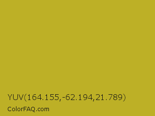 YUV 164.155,-62.194,21.789 Color is a normal yellow color and the nearest color is Hokey Pokey #c8a528. Hex code #bdb026 and RGB value is rgb(189,176,38). In RGB color space, this color is composed of 74% red, 69% green, 15% blue, In CMYK color space, this color is composed of 0% cyan, 7% magenta, 80% yellow , 26% black , In HSL color space, this color has a hue angle of 55° , 67% saturation and 45% lightness.