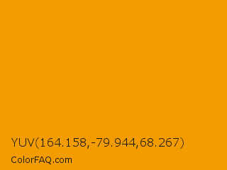 YUV 164.158,-79.944,68.267 Color is a normal orange color and the nearest color is Orange RYB #fb9902. Hex code #f29c02 and RGB value is rgb(242,156,2). In RGB color space, this color is composed of 95% red, 61% green, 1% blue, In CMYK color space, this color is composed of 0% cyan, 36% magenta, 99% yellow , 5% black , In HSL color space, this color has a hue angle of 39° , 98% saturation and 48% lightness.