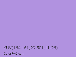 YUV 164.161,29.501,11.26 Color is a light violet color and the nearest color is Light Pastel Purple #b19cd9. Hex code #b192e0 and RGB value is rgb(177,146,224). In RGB color space, this color is composed of 69% red, 57% green, 88% blue, In CMYK color space, this color is composed of 21% cyan, 35% magenta, 0% yellow , 12% black , In HSL color space, this color has a hue angle of 264° , 56% saturation and 73% lightness.