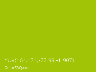 YUV 164.174,-77.98,-1.907 Color is a normal lime color and the nearest color is Citrus #a1c50a. Hex code #a2c406 and RGB value is rgb(162,196,6). In RGB color space, this color is composed of 64% red, 77% green, 2% blue, In CMYK color space, this color is composed of 17% cyan, 0% magenta, 97% yellow , 23% black , In HSL color space, this color has a hue angle of 71° , 94% saturation and 40% lightness.