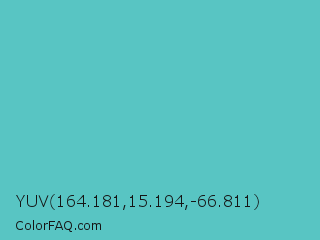 YUV 164.181,15.194,-66.811 Color is a normal cyan color and the nearest color is Sea Serpent #4bc7cf. Hex code #58c5c3 and RGB value is rgb(88,197,195). In RGB color space, this color is composed of 35% red, 77% green, 76% blue, In CMYK color space, this color is composed of 55% cyan, 0% magenta, 1% yellow , 23% black , In HSL color space, this color has a hue angle of 179° , 48% saturation and 56% lightness.