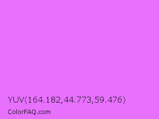 YUV 164.182,44.773,59.476 Color is a light purple color and the nearest color is Heliotrope #df73ff. Hex code #e870ff and RGB value is rgb(232,112,255). In RGB color space, this color is composed of 91% red, 44% green, 100% blue, In CMYK color space, this color is composed of 9% cyan, 56% magenta, 0% yellow , 0% black , In HSL color space, this color has a hue angle of 290° , 100% saturation and 72% lightness.