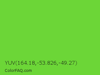 YUV 164.18,-53.826,-49.27 Color is a normal green color and the nearest color is Kiwi #8ee53f. Hex code #6cd637 and RGB value is rgb(108,214,55). In RGB color space, this color is composed of 42% red, 84% green, 22% blue, In CMYK color space, this color is composed of 50% cyan, 0% magenta, 74% yellow , 16% black , In HSL color space, this color has a hue angle of 100° , 66% saturation and 53% lightness.