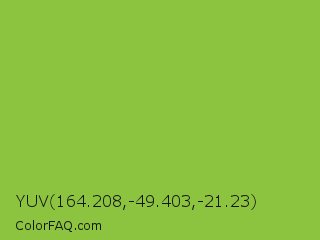 YUV 164.208,-49.403,-21.23 Color is a normal green color and the nearest color is Yellow Green #9acd32. Hex code #8cc440 and RGB value is rgb(140,196,64). In RGB color space, this color is composed of 55% red, 77% green, 25% blue, In CMYK color space, this color is composed of 29% cyan, 0% magenta, 67% yellow , 23% black , In HSL color space, this color has a hue angle of 85° , 53% saturation and 51% lightness.