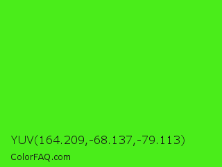 YUV 164.209,-68.137,-79.113 Color is a normal green color and the nearest color is Neon Green #39ff14. Hex code #4aed1a and RGB value is rgb(74,237,26). In RGB color space, this color is composed of 29% red, 93% green, 10% blue, In CMYK color space, this color is composed of 69% cyan, 0% magenta, 89% yellow , 7% black , In HSL color space, this color has a hue angle of 106° , 85% saturation and 52% lightness.
